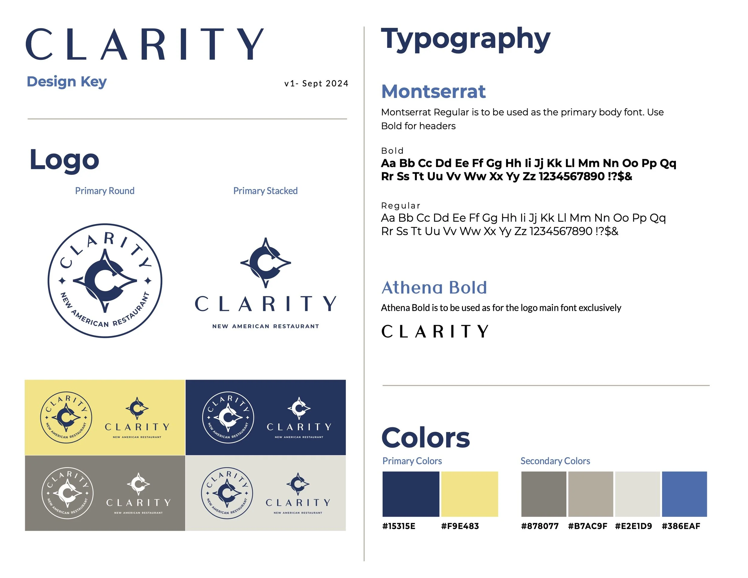 Clarity New American Restaurant identifies itself as casual upscale dining. Promotional deliverables need to match the elegance of an upscale image while not seeming out of place in the relaxed, cozy atmosphere in the restaurant and on socials. Menu deliverable was requested to match existing assets in font and layout.